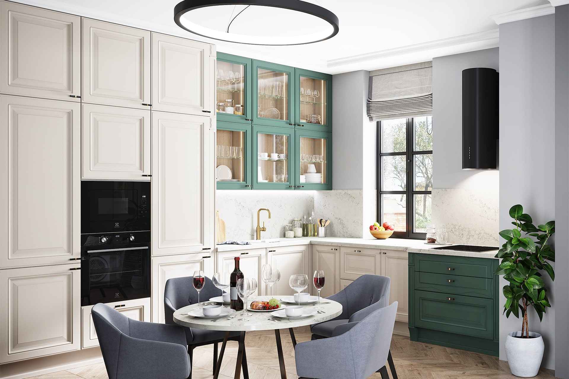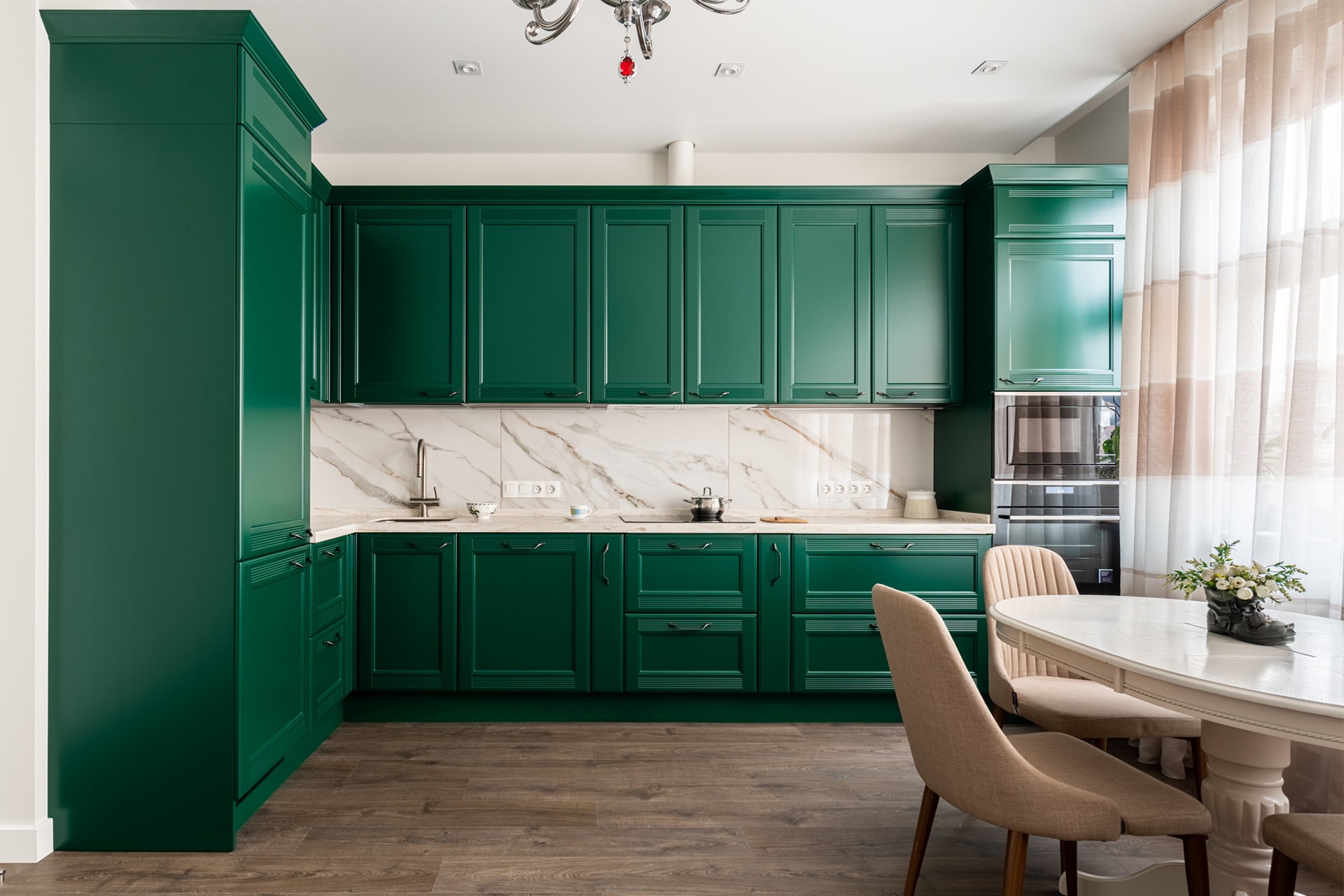 Хорошая новость: гарнитуры в зеленом и изумрудном исполнении универсальны, их можно использовать для любого стиля. Главное – правильный выбор оттенка и текстуры фасадов мебели.