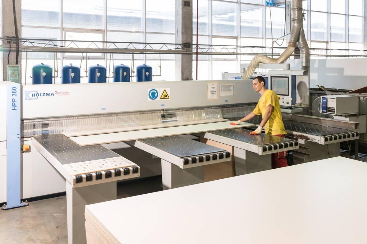 На станке Holmza (Германия) лист ДСП распиливается на части нужных размеров. Оборудование управляется компьютером — погрешность при раскрое минимальна. Материал располагается на воздушной подушке, которая защищает его от царапин.